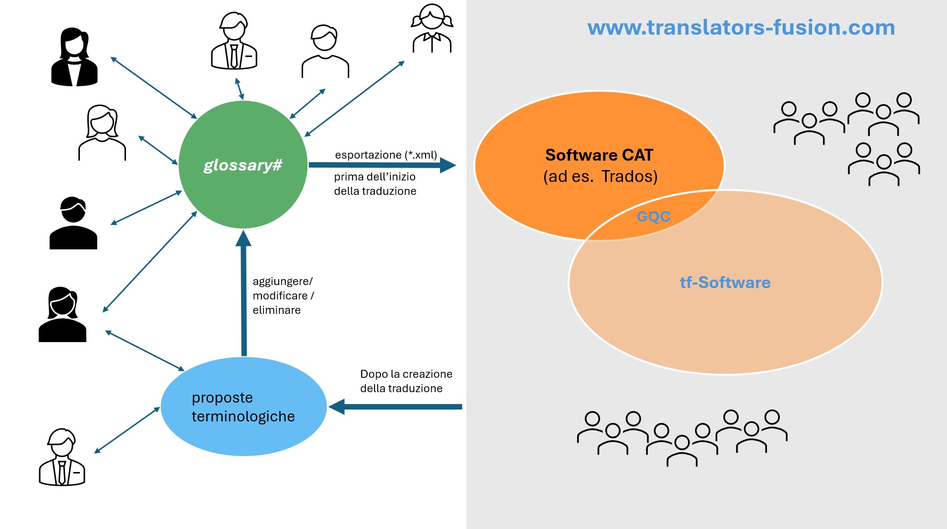 La terminologia raccolta nel glossary# può essere esportata in qualsiasi software CAT (Computer Aided Translation), come Trados Studio (*.xml / *.xdt / *.csv / *.xlsx).